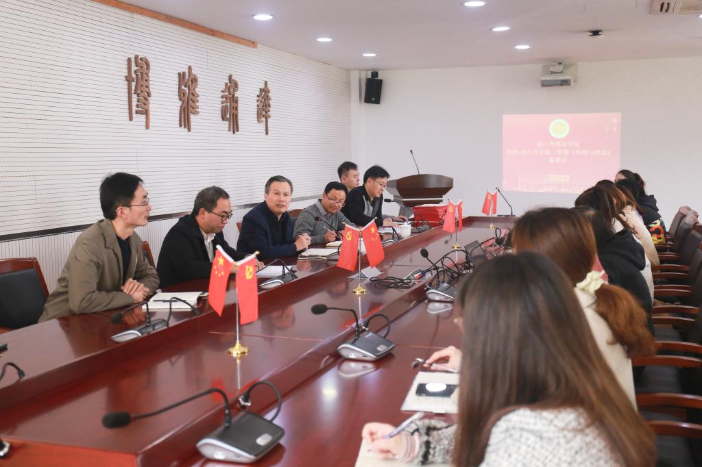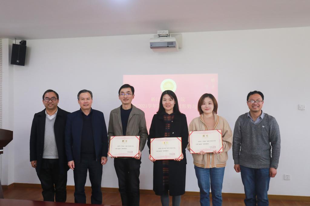 如期举行集体备课会以及前期准备工作表示肯定,对承担形势与政策主讲任务并出席本次备课会的全体教师的辛勤付出表示理解与谢意,就如何上好此次形势与政策课,提升教学效果发表重要讲话。本学期三个专题紧密结合国内外经济社会发展大事,对学生进行及时教学非常必要,各专题内容需做好整合与处理,避免简单重复。形势政策课不仅要讲清讲透国家政策,更要注重“四个结合”:1.结合浙江实际,尤其是结合习近平总书记提出我省打造“重要窗口”一周年、打造先行省、建设共同富裕高地等热点;2.结合我校实际,特别是我校“十四五”规划提出的一些主要指标,主讲老师结合“知校爱校”主题教育,亲自参观校史馆;3.结合身边的人和事,介绍身边优秀的教师与学生,讲好浙外故事;4.结合学院实际,让同学更好地了解自身学院正在发生和即将发生的大事。