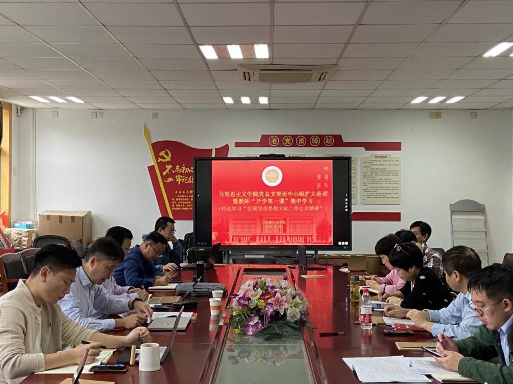 会议强调,一要切实提高政治站位,深刻认识宣传思想文化工作的重大意义,宣传思想文化工作事关党的前途命运,事关国家长治久安,事关民族凝聚力和向心力,是一项极端重要的工作;二要切实学懂弄通习近平文化思想,围绕贯彻党的二十大关于文化建设的战略部署,切实增强做好新时代新征程宣传思想文化工作的责任感和使命感;三要在深化内化转化上下功夫,坚持不懈用习近平新时代中国特色社会主义思想凝心铸魂,将学习成果及时融入教师的科研和课堂教学上。