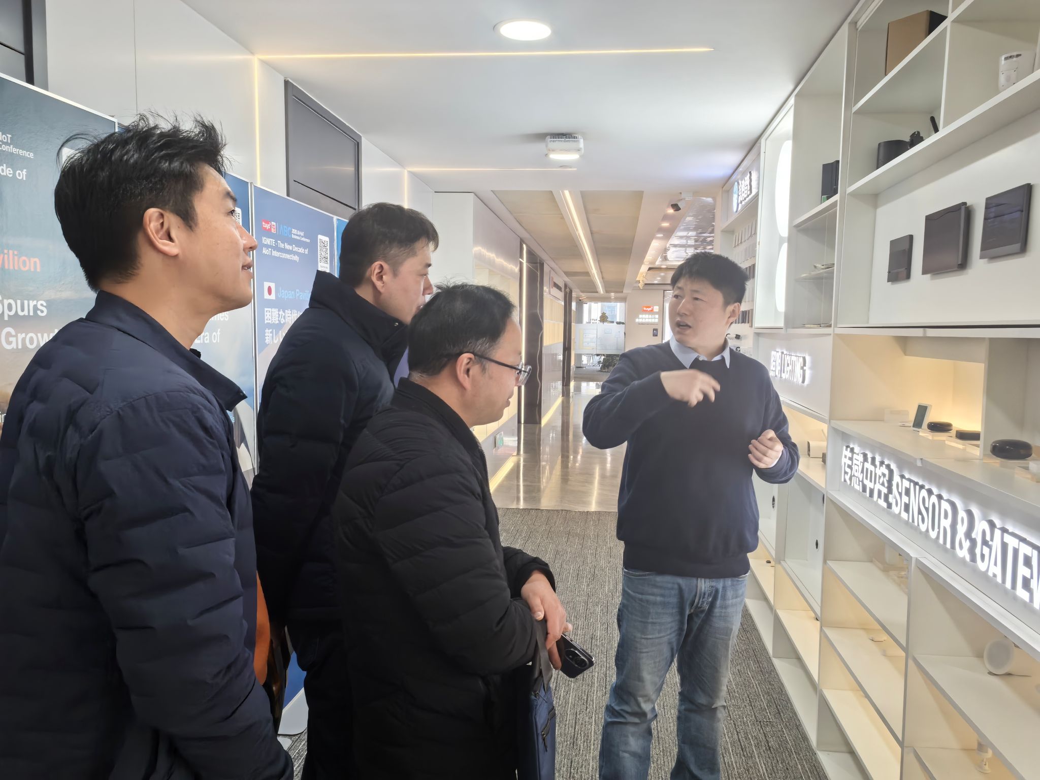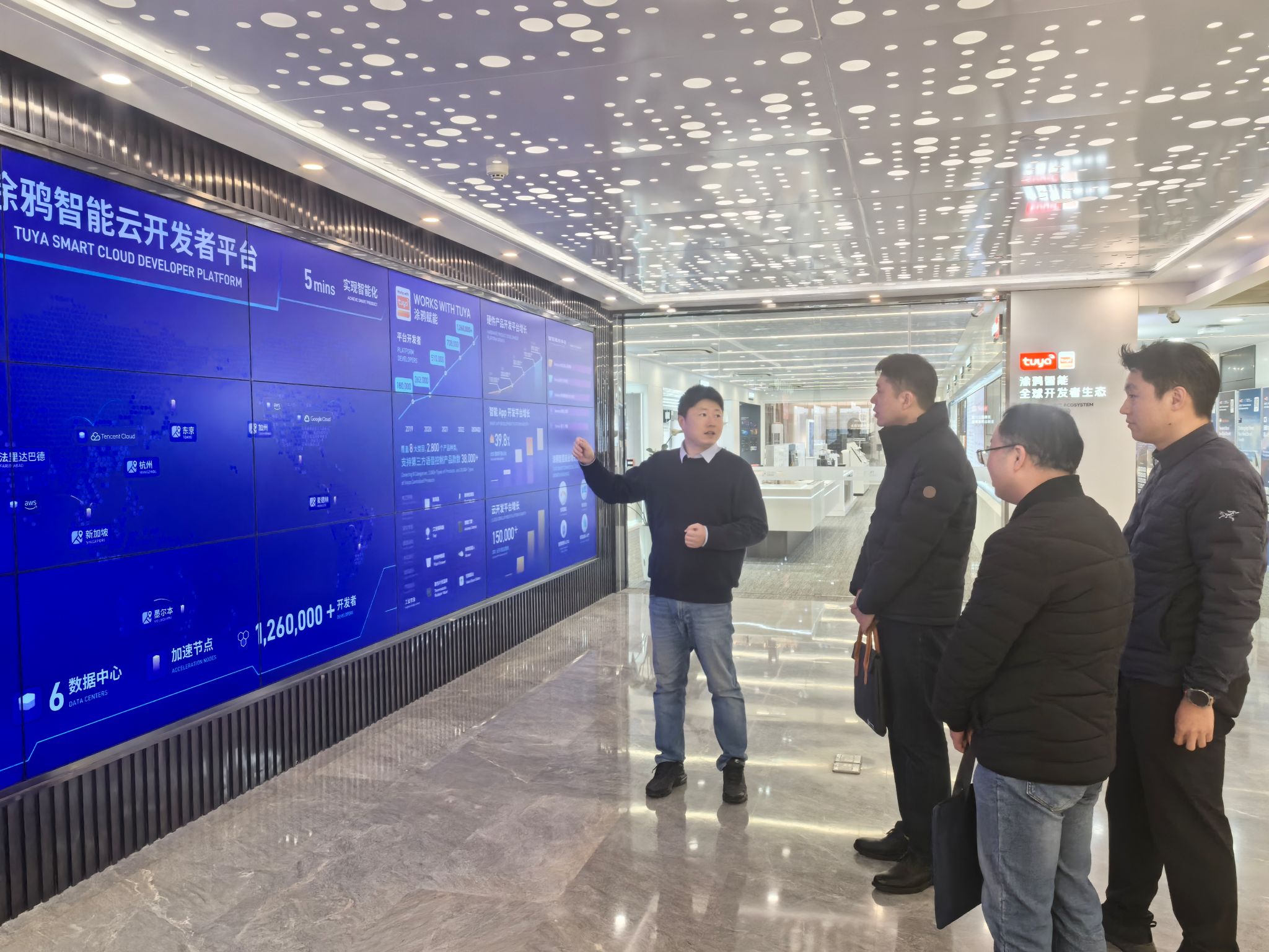 在调研过程中,公司副总裁刘帆对学院一行的到来表示欢迎,他带领学院一行参观了涂鸦智能企业体验馆,详细介绍了涂鸦智能在硬件智能化、智慧商业等方面的具体应用以及海外各个国家的智能化市场情况。参观结束后,双方进行了座谈。