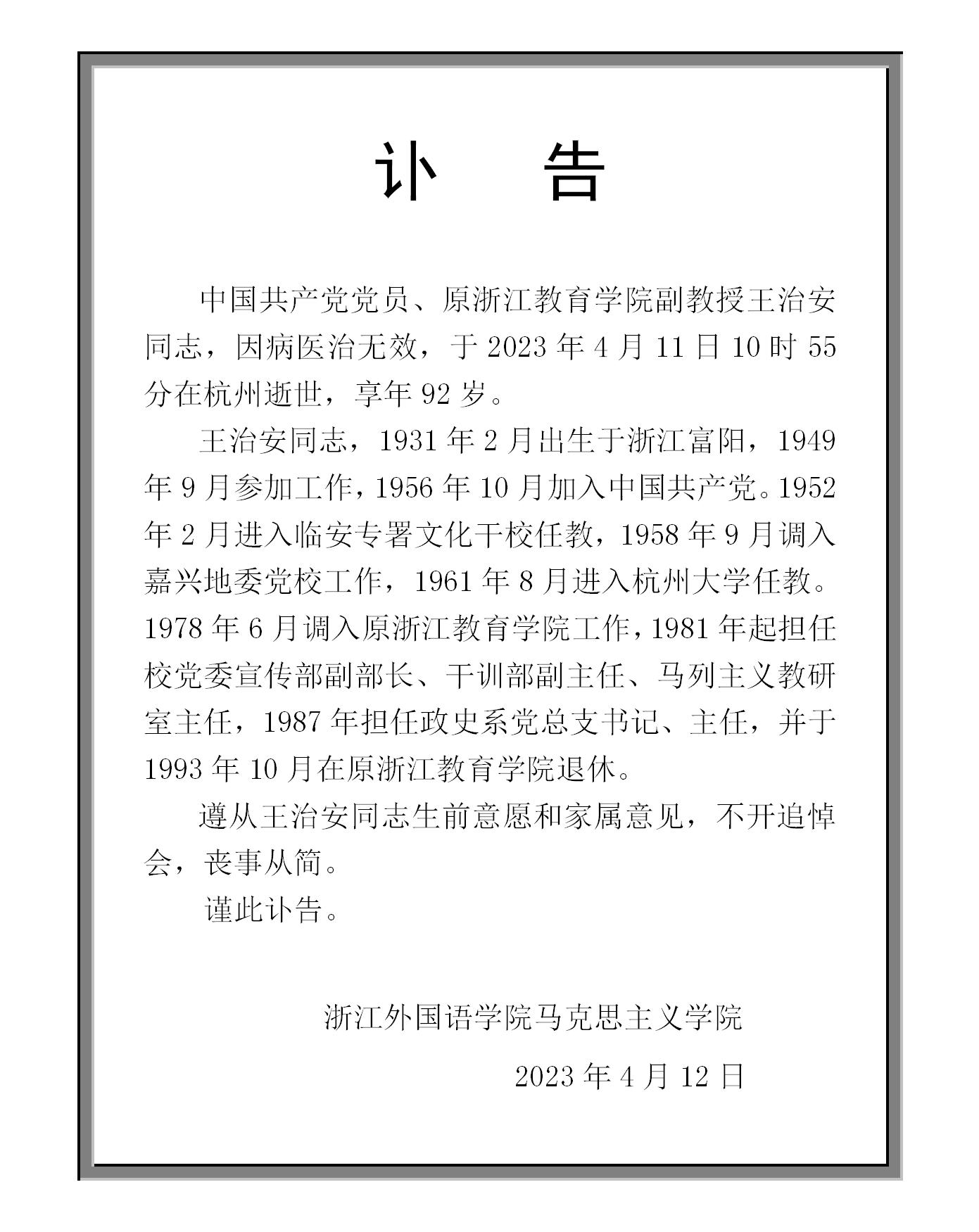 王治安同志讣告