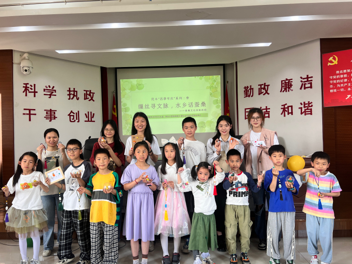 除了展览,实践团队还在民丰村举办蚕桑文化体验课,以“课堂+游戏”的形式,在轻松愉快的学习氛围中,给小朋友们科普了蚕桑文化知识。