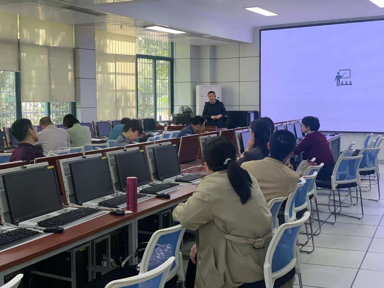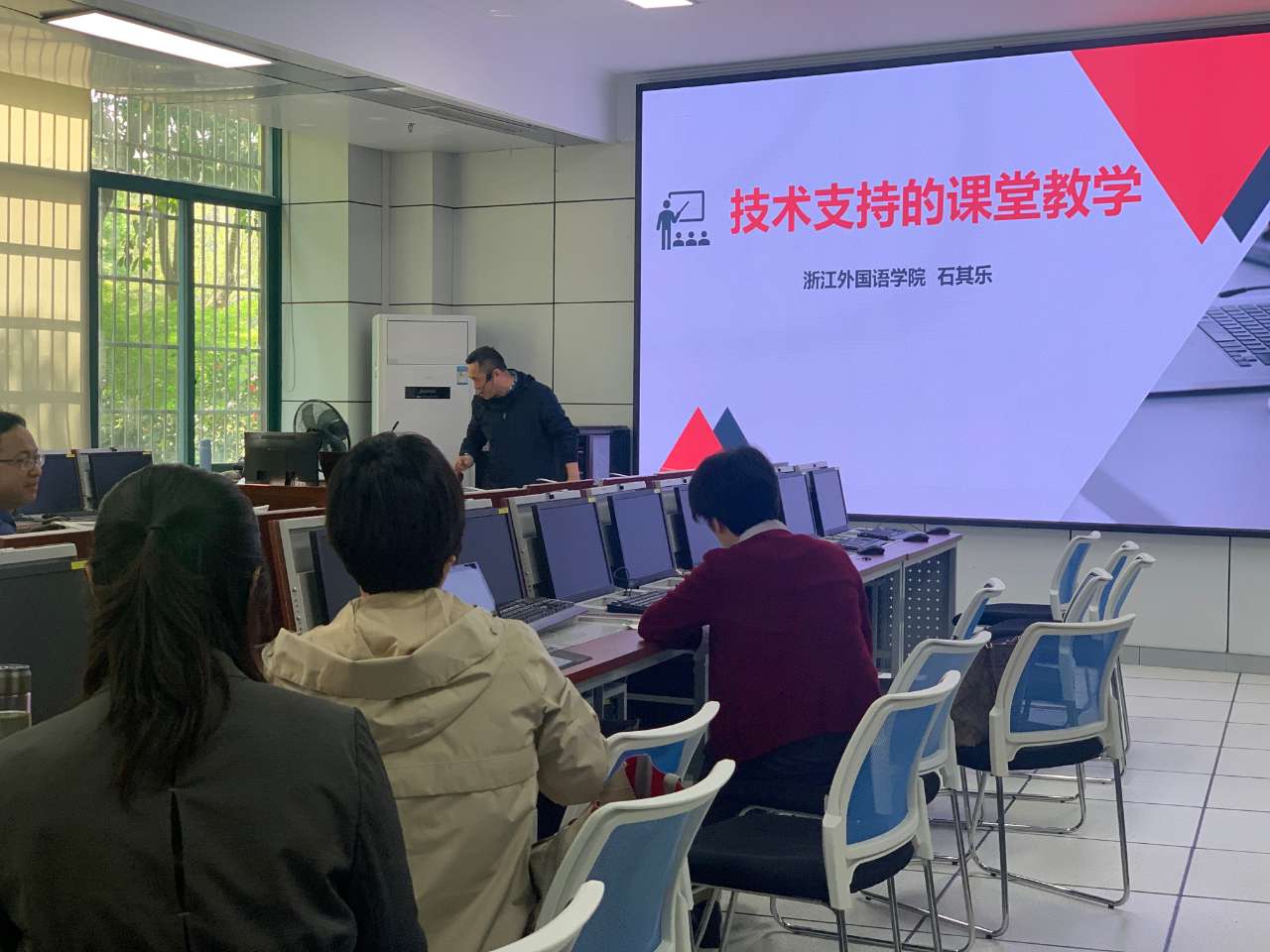 石其乐副教授围绕“技术支持的课堂教学”这一主题,从为什么在教学中用技术、数字媒体数据的编辑与制作、新型数字化教学工具、PowerPoint新体验,这四个方面进行了两个半小时的讲解,详细介绍了文本、图像、动画、视频、音频等数字资源软件处理方法,以及在线平台的利用方式。讲座氛围热烈,与会教师认真聆听并作记录。