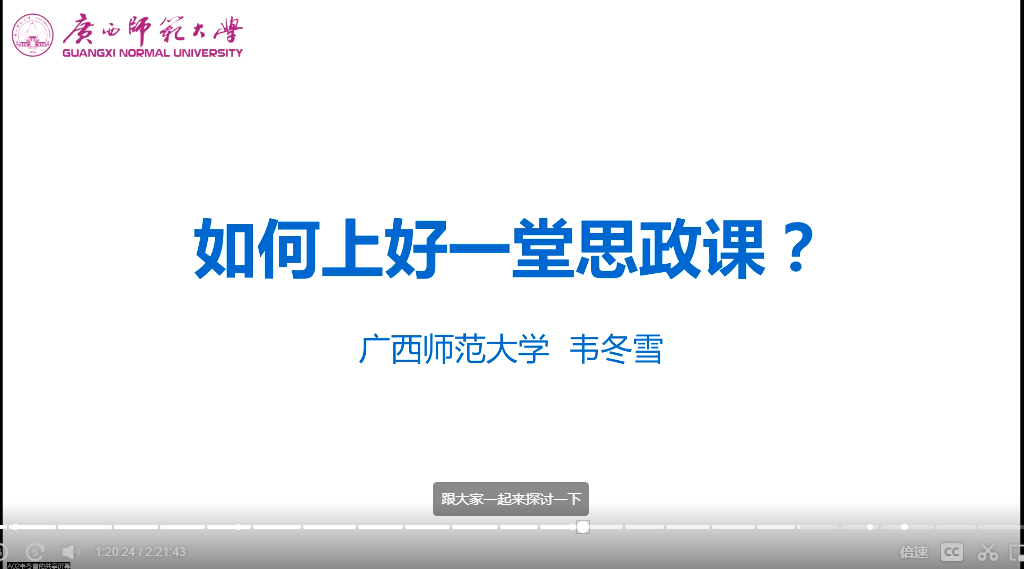 广西师范大学韦冬雪教授以“如何上好一堂思政课”为题,从“思想政治理论课教育教学与其他课程的差别”、“怎么样的课堂教学是好的课堂”两个方面,从教学论的角度谈了对提升思政课教学实效性的思考与总结。